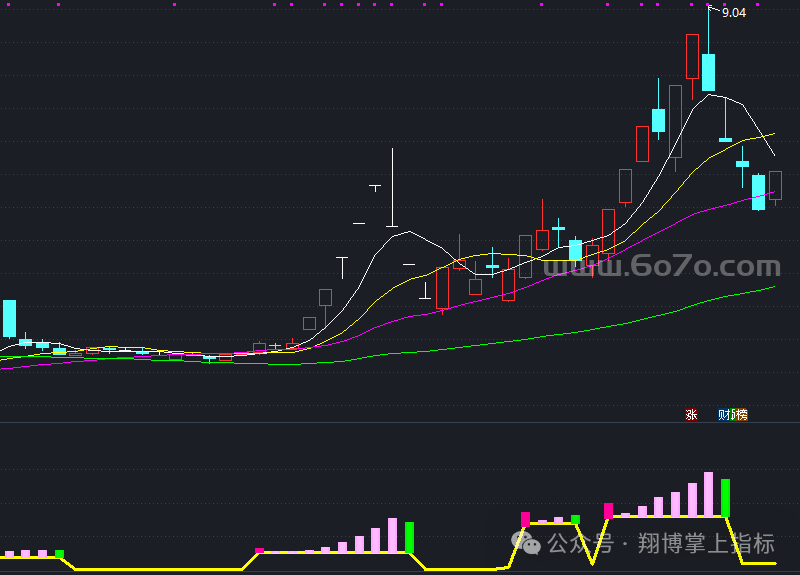 • 趋势判断:YF_DDING:=EMA(CLOSE,6)(6日均线平滑)• 背离检测:YF_TDCG:=((YF_MMD - YF_YYZ)/YF_YYZ)*100(价格与均线偏离度)