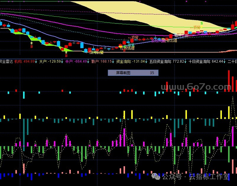 而一位私募老友的实战数据更令人震撼:通过「资金雷达」指标,他在某新能源龙头股暴跌前 3 天精准清仓,仅凭一个信号 ——“紫色中户线与黄色大户线连续三日背离”。