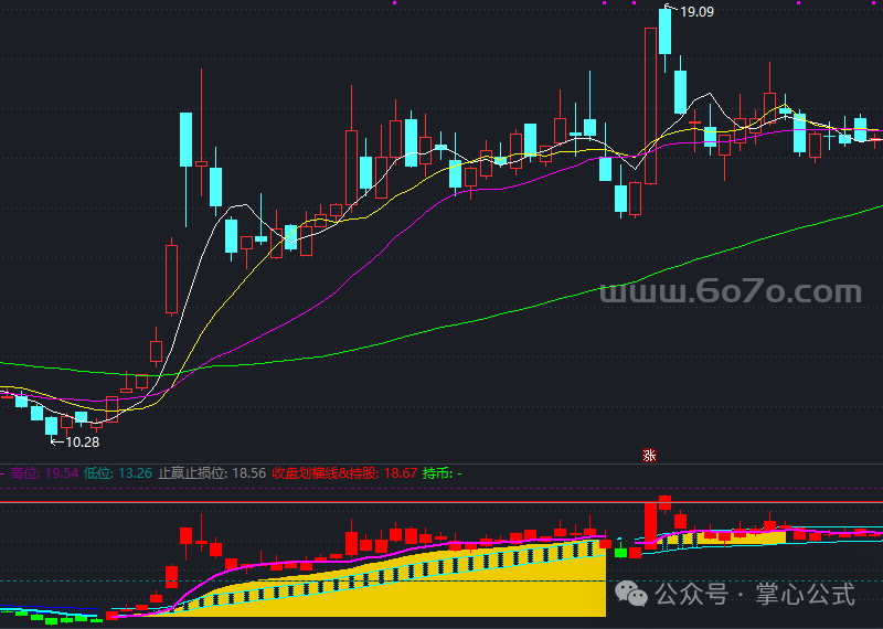 🔵 青色持股区:收盘价 > MA1,趋势涨紫线托底