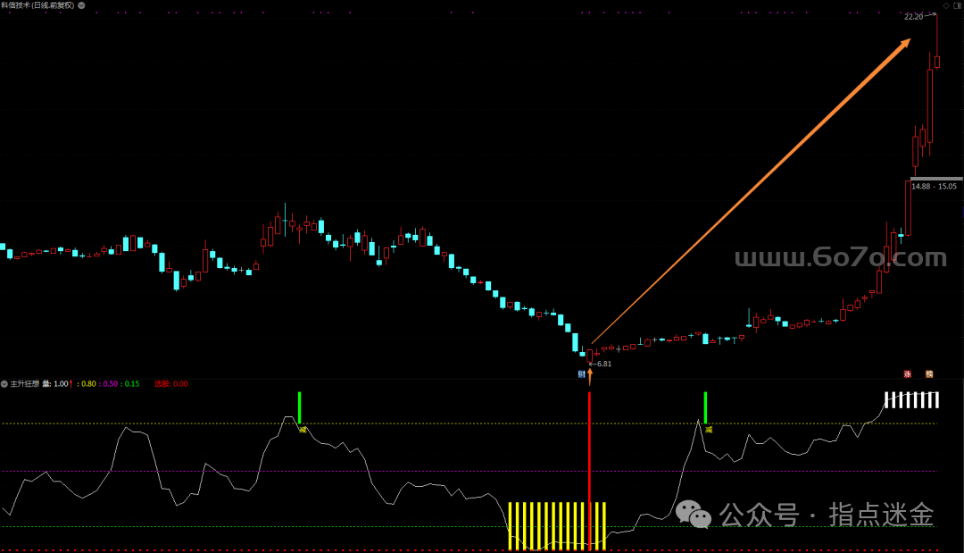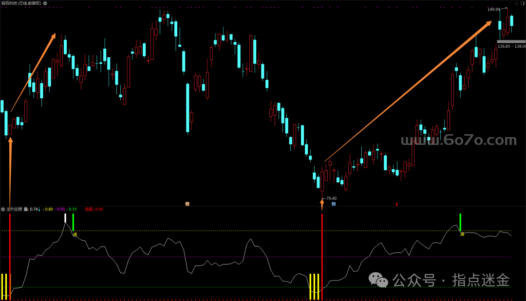 VAR2)突破 20 且形成 “底背离”,同时价格突破多空分水岭(SM03),触发红色柱状信号,预示趋势反转。案例:2025 年 1 月,某 AI 芯片股 出现红柱信号,MACD 同步金叉,随后走出 3 连板主升浪。