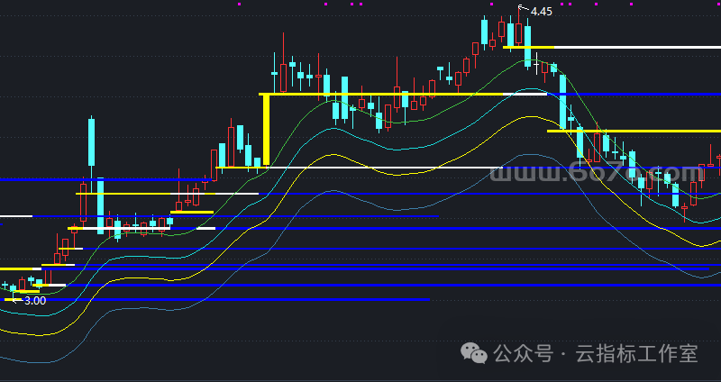 动态划线系统 :画出主力的「成本护城河」。根据周期爆量日,画不同颜色支撑线:黄色(短期)、白色(中期)、蓝色群(长期)。