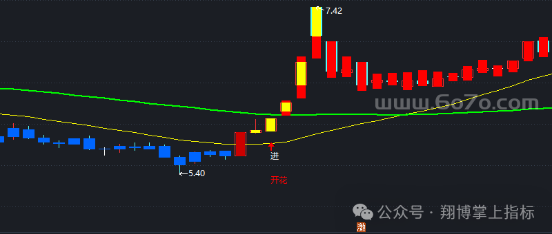 “进” 字信号 = 白线上穿黄线 + 股价站稳 20 日均线(黄色区域)