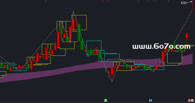 通达信智能五日箱体主图指标源码:MA60:=MA(CLOSE,60)COLORMAGENTA;MA120:=MA(CLOSE,120)COLORLIRED;DRAWBAND(MA(CLOSE,60),RGB(96,50,96),MA(CLOSE,120),RGB(15,96,96));STICKLINE(OPEN<=REF(LOW,5)AND REF(LOW,WEEKDAY)<REF(LOW,5),REF(LOW,5),REF(LOW,WEEKDAY),20,1),COLORCYAN;STICKLINE(OPEN>=REF(HIGH,5)AND REF(HIGH,WEEKDAY)>REF(HIGH,5),REF(HIGH,5),REF(HIGH,WEEKDAY),20,01),COLORYELLOW;{阳K线}STICKLINE(CLOSE>=OPEN,C,O,4.7,0),COLOR000033;STICKLINE(CLOSE>=OPEN,C,O,3.9,0),COLOR000055;STICKLINE(CLOSE>=OPEN,C,O,3,0),COLOR000077;STICKLINE(CLOSE>=OPEN,C,O,2.1,0),COLOR000099;STICKLINE(CLOSE>=OPEN,C,O,1,0),COLOR0000DD;{阳线上下影}STICKLINE(CLOSE>=OPEN,L,H,0,0), COLORRED;{阴K线}STICKLINE(CLOSE<OPEN,C,O,4.7,0),COLOR003300;STICKLINE(CLOSE<OPEN,C,O,3.9,0),COLOR005500;STICKLINE(CLOSE<OPEN,C,O,3,0),COLOR007700;STICKLINE(CLOSE<OPEN,C,O,2.1,0),COLOR009900;STICKLINE(CLOSE<OPEN,C,O,1,0),COLOR00DD00;{阴线上下影}STICKLINE(CLOSE<OPEN,L,H,0,0), COLOR00EC00;A1:=REF(HIGH,3)=HHV(HIGH,2*3+1); B1:=FILTER(A1,3); C1:=BACKSET(B1,3+1); D1:=FILTER(C1,3);{高点}A2:=REF(LOW,3)=LLV(LOW,2*3+1); B2:=FILTER(A2,3); C2:=BACKSET(B2,3+1); D2:=FILTER(C2,3);{低点}E1:=(REF(LLV(LOW,2*3),1)+REF(HHV(HIGH,2*3),1))/2; E2:=(HIGH+LOW)/2;{高低点出现在同一K线上时可作取舍}H1:=(D1 AND NOT(D2 AND E1>=E2)) OR ISLASTBAR OR BARSCOUNT(CLOSE)=1;L1:=(D2 AND NOT(D1 AND E1<E2)); H2:=D1 AND NOT(D2 AND E1>=E2);X1:=REF(BARSLAST(H1),1)+1; F1:=BACKSET(H1 AND COUNT(L1,X1)>0,LLVBARS(IF(L1,LOW,10000),X1));G1:=F1>REF(F1,1);I1:=BACKSET(G1,2);LD:=I1>REF(I1,1);{过滤后低点}L2:=LD OR ISLASTBAR OR BARSCOUNT(CLOSE)=1;X2:=REF(BARSLAST(L2),1)+1; F2:=BACKSET(L2 AND COUNT(H2,X2)>0,HHVBARS(IF(H2,HIGH,0),X2));G2:=F2>REF(F2,1);I2:=BACKSET(G2,2);HD:=I2>REF(I2,1);{过滤后高点}DRAWLINE(LD,L,HD,H,0),COLORWHITE,LINETHICK1,DOTLINE;DRAWLINE(HD,H,LD,L,0),COLORWHITE,LINETHICK1,DOTLINE;J1:=BACKSET(ISLASTBAR,MIN(BARSLAST(HD),BARSLAST(LD))+1); J2:=J1>REF(J1,1);DRAWLINE(J2,IF(HD,H,L),ISLASTBAR,IF(BARSLAST(HD)>BARSLAST(LD),H,L),0),COLORWHITE,LINETHICK1,DOTLINE;