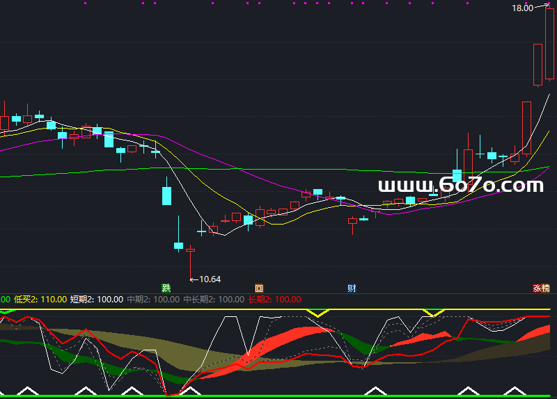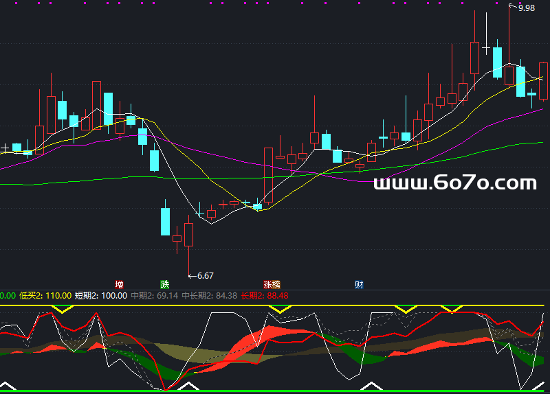 低买2:IF((CROSS(长强势区2,0.1)),100,110),COLOR00FFFF,LINETHICK3;