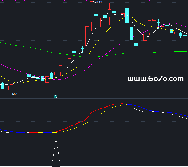 红升区域 :白线在黄线上方,红柱体出现,多头力量占优,波段上涨概率大