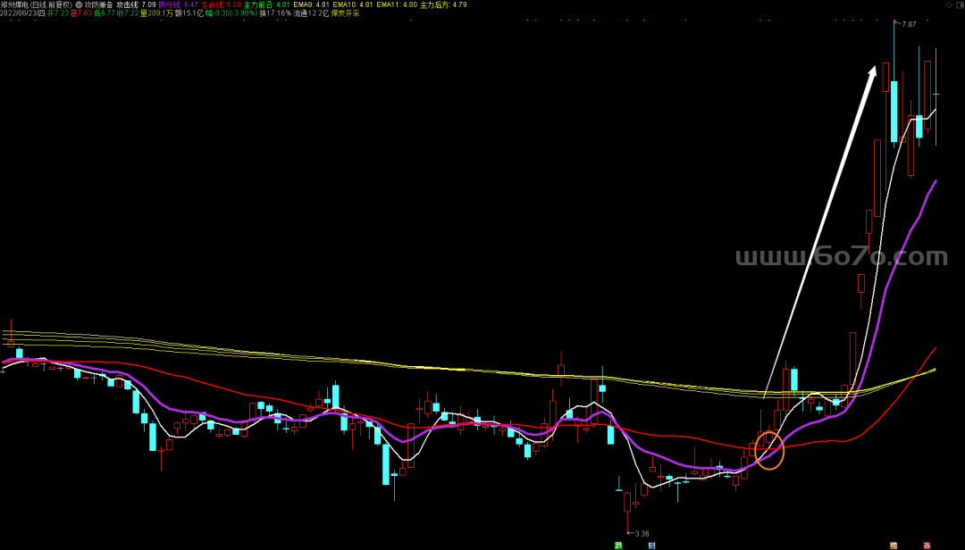 主力前沿(EMA153)这条隐形均线,是机构资金的 “藏宝图”。去年 10 月三六零在 30 元附近反复震荡时,这条线始终托底,后来成为中特估行情的领头羊。