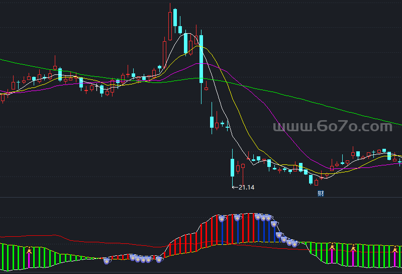 量能:=AMOUNT/10000000,COLORWHITE STICK;量能1:MA(量能,21),COLORWHITE LINETHICK1;量能2:MA(量能,55),COLORYELLOW LINETHICK1;量能3:MA(量能,89),COLORRED LINETHICK1;STICKLINE(量能1>量能2,量能2,量能1,0.001,0),COLORRED;STICKLINE(量能1<REF(量能1,1), 量能2,量能1,0.001,0),COLORCC3300;STICKLINE(量能1<量能2,量能2,量能1,0.001,0),COLORGREEN;STICKLINE(量能2>REF(量能2,1)AND 量能1<量能2,量能2,量能1,0.001,0),COLORFF00FF;DRAWICON(量能2>REF(量能2,1)AND 量能1<量能2,量能2,15);DRAWICON(量能1<REF(量能1,1)AND 量能2<量能1,量能1,19);