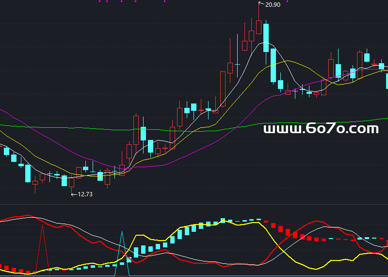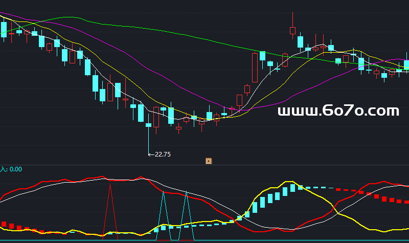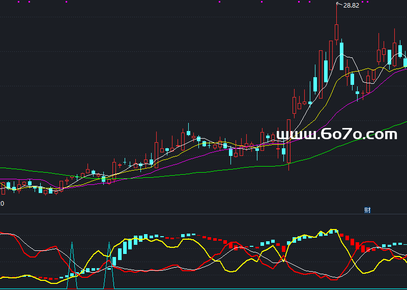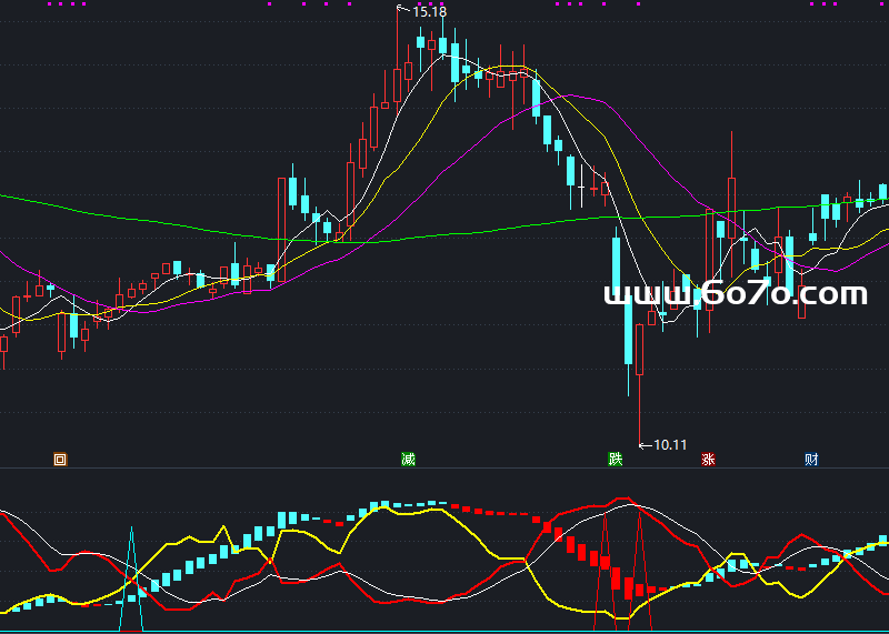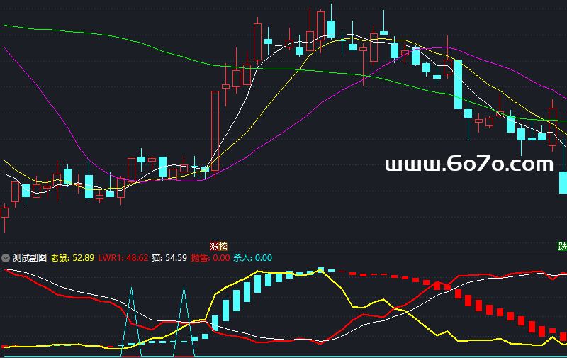 VAR10:=LLV(LOW,10); VAR13:=HHV(HIGH,25);老鼠:EMA((CLOSE-VAR10)/(VAR13-VAR10)*4,4)*25,COLORYELLOW,LINETHICK2; // 短期动能线RSV10:= (HHV(HIGH,11)-CLOSE)/(HHV(HIGH,11)-LLV(LOW,11))*100;LWR1:SMA(RSV10,3,1),COLORRED,LINETHICK2; // 相对位置指标猫:SMA(LWR1,3,1),COLORWHITE; // 趋势确认线