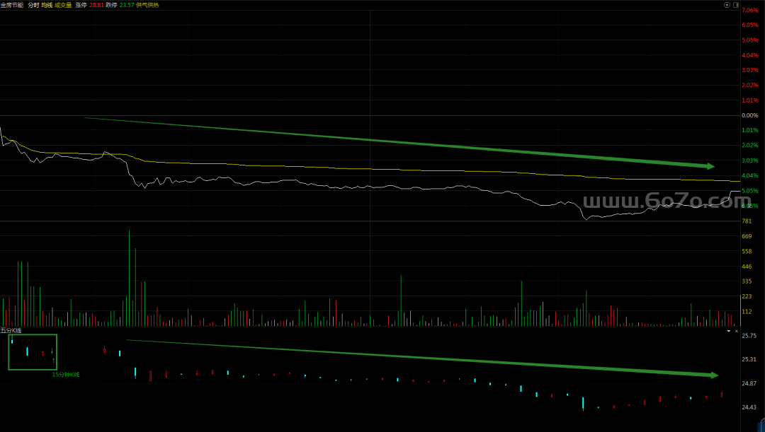(操作)结合 “K 线解盘指标”,在 5 分钟第二根青柱(9:51)止损,规避后续 13% 跌幅。