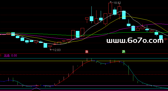 出击:IF((趋势>REF(趋势,1)) AND (REF(趋势,1)<REF(趋势,2)) AND (趋势<0.5),0.3,0);
