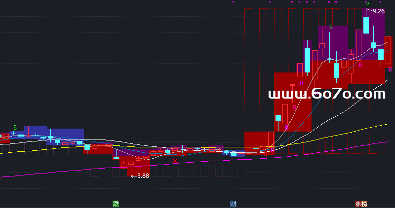 MC:=C#MONTH,NODRAW;MH:=H#MONTH,NODRAW;ML:=L#MONTH,NODRAW;MO1:=IF(DAY<REF(DAY,1),O,DRAWNULL);MO:=HHV(MO1,DAY),NODRAW;STICKLINE(MC>=MO,MH,ML,4,-1)COLOR00009C;STICKLINE(MC<=MO,MH,ML,4,-1),COLOR4F2F4F;周O1:=IF(WEEKDAY<REF(WEEKDAY,1),O,DRAWNULL);周开:HHV(周O1,WEEKDAY)COLORRED,NODRAW;周高:HHV(H,WEEKDAY)COLORYELLOW,NODRAW;周低:LLV(L,WEEKDAY)COLOR32CD32,NODRAW;周收:C#WEEK, COLORFF6EC7,NODRAW;STICKLINE(周收>=周开,周收,周高,4,0)COLOR600060;STICKLINE(周收>=周开,周低,周收,4,0)COLOR00009C;STICKLINE(周收<周开,周收,周高,4,0),COLOR9F3333;STICKLINE(周收<周开,周开,周低,4,0),COLOR9F3333; MA5:MA(C,5);MA10:MA(C,10);MA20:MA(C,20);MA60:MA(C,60);MA120:MA(C,120);{STICKLINE(MA5>=MA60 AND MA60>=MA10,MA10,MA60,1,-1),COLORBLUE;STICKLINE(MA5>=MA10 AND MA5<=MA60,MA10,MA5,1,-1),COLORBLUE;STICKLINE(MA20>=MA60 AND MA60>=MA40,MA40,MA60,1,-1),COLORFF00FF;STICKLINE(MA20>=MA40 AND MA20<MA60,MA40,MA20,1,-1),COLORFF00FF;STICKLINE(MA5>=MA20 AND MA20>=MA10,MA10,MA20,1,-1),COLORYELLOW;STICKLINE(MA5>=MA10 AND MA5<MA20,MA10,MA5,1,-1),COLORYELLOW;}上开:=O;上收:=C;上高:=H;上低:=L;JJ:=(上开+上高+上低)/3;A:=EMA(JJ,4);黄金线A:=A;VA1:=EMA(上收,8);VA2:=EMA(上收,20);DRAWTEXT(CROSS(VA1,VA2)AND(C>=O)AND 黄金线A>REF(黄金线A,1),VA1*0.97,'B')COLORRED;VAR3P:=IF(CLOSE/REF(CLOSE,1)>1.050 AND HIGH/CLOSE<1.010 AND IF(CLOSE>REF(CLOSE,1),88,0)>0, 91, 0);DRAWTEXT(VAR3P>90,LOW*0.978,'B')COLORMAGENTA;DRAWTEXT(CROSS(REF(ZIG(3,10),1),ZIG(3,10)),HIGH*1.02,'S')COLORGREEN;VAR1:=EMA(EMA(CLOSE,13),13);控盘:= (VAR1-REF(VAR1,1))/REF(VAR1,1)*1000;有庄控盘:=控盘>REF(控盘,1) AND 控盘>0;SS:=有庄控盘 AND CROSS(EMA(C,3),EMA(C,5)) AND C>O AND C>REF(C,1) AND C/REF(C,1)>=1.018OR CROSS(EMA(C,3),EMA(C,12)) AND C>O AND C>REF(C,1) AND C/REF(C,1)>=1.018OR CROSS(EMA(C,5),EMA(C,7)) AND C>O AND C>REF(C,1) AND C/REF(C,1)>=1.018OR CROSS(EMA(C,3),EMA(C,7)) AND C>O AND C>REF(C,1) AND C/REF(C,1)>=1.018 AND CROSS(EMA(C,3),EMA(C,12));DRAWICON(SS,LOW*0.978,36);DRAWKLINE(H,O,L,C);AAA:=CONST(HHV(H,90));ABB:=MA(CLOSE,20);ACC:=(CLOSE > MA(CLOSE,5));ADD:=(MA(CLOSE,5) > MA(CLOSE,10));AEE:=(CLOSE > MA(CLOSE,10));AFF:=(MA(CLOSE,5) > MA(CLOSE,20));AGG:=(CLOSE > MA(CLOSE,20));AHH:=REF(ABB,1);AII:=(ABB > AHH); AVX:=(((((IF(ACC,10,(0 - 10)) + IF(ADD,10,(0 - 10))) + IF(AEE,10,(0 - 10)))+ IF(AFF,10,(0 - 10))) + IF(AGG,10,(0 - 10))) + IF(AII,10,(0 - 10)));DSLX:=(CLOSE / INDEXC);DSLX1:=MA(DSLX,5);DSLX2:=MA(DSLX,10);V1:=MA(VOL,5);V2:=MA(VOL,10);T1:=CONST(IF(C<200 AND ((CROSS(AVX,1) AND (V1 >= V2)) AND (DSLX >= DSLX1)),1,0));T2:=CONST(IF(C<200 AND ((CROSS(AVX,1) AND (V1 < V2)) AND (DSLX >= DSLX1)),1,0));T3:=CONST(IF(C<200 AND ((CROSS(AVX,1) AND (V1 > V2)) AND (DSLX < DSLX1)),1,0));T4:=CONST(IF(C<200 AND ((CROSS(AVX,1) AND (V1 <= V2)) AND (DSLX < DSLX1)),1,0));T5:=CONST(IF(C<200 AND ((CROSS(1,AVX) AND (V1 >= V2)) AND (DSLX >= DSLX1)),1,0));T6:=CONST(IF(C<200 AND ((CROSS(1,AVX) AND (V1 < V2)) AND (DSLX >= DSLX1)),1,0));T7:=CONST(IF(C<200 AND ((CROSS(1,AVX) AND (V1 >= V2)) AND (DSLX < DSLX1)),1,0));T8:=CONST(IF(C<200 AND ((CROSS(1,AVX) AND (V1 < V2)) AND (DSLX < DSLX1)),1,0));T9:=CONST(IF(C<200 AND ((((AVX >= 1) AND (REF(AVX,1) > 0)) AND (V1 >= V2)) AND (DSLX >= DSLX1)),1,0));T10:=CONST(IF(C<200 AND ((((AVX >= 1) AND (REF(AVX,1) > 0)) AND (V1 < V2)) AND (DSLX >= DSLX1)),1,0));T11:=CONST(IF(C<200 AND ((((AVX >= 1) AND (REF(AVX,1) > 0)) AND (V1 >= V2)) AND (DSLX < DSLX1)),1,0));T12:=CONST(IF(C<200 AND ((((AVX >= 1) AND (REF(AVX,1) > 0)) AND (V1 < V2)) AND (DSLX < DSLX1)),1,0));T13:=CONST(IF(C<200 AND ((((AVX < 1) AND (REF(AVX,1) < 0)) AND (V1 >= V2)) AND (DSLX >= DSLX1)),1,0));T14:=CONST(IF( C<200 AND ((((AVX < 1) AND (REF(AVX,1) < 0)) AND (V1 < V2)) AND (DSLX >= DSLX1)),1,0));T15:=CONST(IF(C<200 AND ((((AVX < 1) AND (REF(AVX,1) < 0)) AND (V1 >= V2)) AND (DSLX < DSLX1)),1,0));T16:=CONST(IF(C<200 AND ((((AVX < 1) AND (REF(AVX,1) < 0)) AND (V1 < V2)) AND (DSLX < DSLX1)),1,0));T17:=CONST(IF(C>200 AND (CROSS(AVX,1) AND (V1 >= V2)),1,0));T18:=CONST(IF(C>200 AND (CROSS(AVX,1) AND (V1 >= V2)),1,0));T19:=CONST(IF(C>200 AND (CROSS(AVX,1) AND (V1 < V2)),1,0));T20:=CONST(IF(C>200 AND (CROSS(1,AVX) AND (V1 >= V2)),1,0));T21:=CONST(IF(C>200 AND (CROSS(1,AVX) AND (V1 < V2)),1,0));T22:=CONST(IF(C>200 AND (((AVX >= 1) AND (REF(AVX,1) > 0)) AND (V1 >= V2)),1,0));T23:=CONST(IF(C>200 AND (((AVX >= 1) AND (REF(AVX,1) > 0)) AND (V1 < V2)),1,0));T24:=CONST(IF(C>200 AND (((AVX < 1) AND (REF(AVX,1) < 0)) AND (V1 >= V2)),1,0));T25:=CONST(IF(C>200 AND (((AVX < 1) AND (REF(AVX,1) < 0)) AND (V1 < V2)),1,0));DRAWTEXT(T1=1 AND CURRBARSCOUNT=80,AAA-(AAA*0.03),'量能理想,明显走强,中线参与,仓位在2/3左右'),COLORFF00FF ;DRAWTEXT(T2=1 AND CURRBARSCOUNT=80,AAA-(AAA*0.03),'走势趋强,还显不足,短线进场,仓位在1/2左右'),COLORRED ;DRAWTEXT(T3=1 AND CURRBARSCOUNT=80,AAA-(AAA*0.03),'量价良好,没有明显走强,短线进场,仓位1/2左右'),COLORRED ;DRAWTEXT(T4=1 AND CURRBARSCOUNT=80,AAA-(AAA*0.03),'形态尚可,量能不足,未完全走强,短线参与,仓位1/3左右'),COLORRED ;DRAWTEXT(T5=1 AND CURRBARSCOUNT=80,AAA-(AAA*0.03),'形态变坏,重仓者减持大半,清仓者观望'),COLORF0F000 ;DRAWTEXT(T6=1 AND CURRBARSCOUNT=80,AAA*0.98 ,'随大盘一起下跌,明显缩量走势,考虑到风险,减持或清仓'),COLORF0F000 ;DRAWTEXT(T7=1 AND CURRBARSCOUNT=80,AAA-(AAA*0.03),'该股放量下跌,走势明显偏弱,离场观望'),COLORF0F000 ;DRAWTEXT(T8=1 AND CURRBARSCOUNT=80,AAA-(AAA*0.03),'该股缩量下跌,走势偏弱,离场观望'),COLORF0F000 ;DRAWTEXT(T9=1 AND CURRBARSCOUNT=80,AAA-(AAA*0.03),'该股形态良好,强势明显,量能充足,可以继续持有'),COLORRED ;DRAWTEXT(T10=1 AND CURRBARSCOUNT=80,AAA-(AAA*0.03),'上行趋势不变,强势依然,量能开始转弱,注意风险'),COLORRED ;DRAWTEXT(T11=1 AND CURRBARSCOUNT=80,AAA-(AAA*0.03),'该股仍然具备上涨潜力,但股性偏弱,可考虑减仓'),COLORFF99FF ;DRAWTEXT(T12=1 AND CURRBARSCOUNT=80,AAA-(AAA*0.03),'该股走势趋弱,量能不足,减持大部分筹码'),