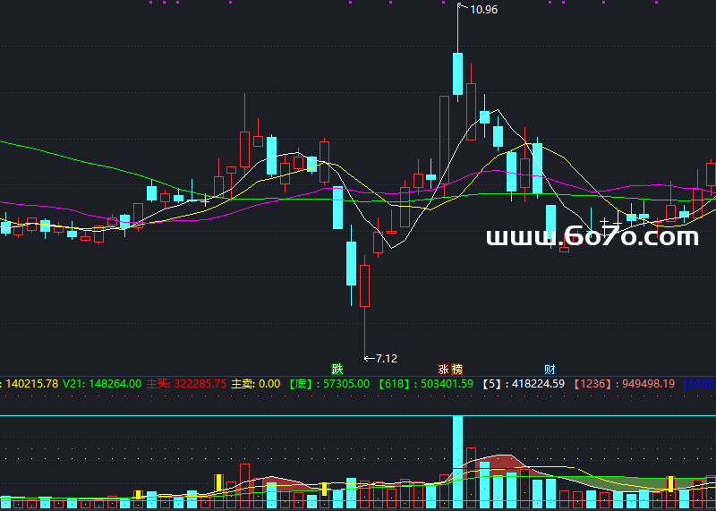 这个指标把 5 日 / 21 日均量线做成色带,红绿相间像彩虹糖。白黄绿三色均线是短中长趋势,主买主卖红黄点像打地鼠。最骚的是黄金分割位:0.382 是起跑线,1.236 是冲刺区。#技术分析 #量价关系