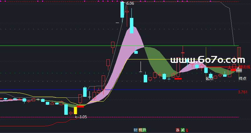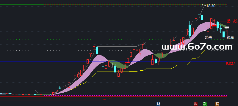 配合 “起点” 与 “终点” 黄线(区间成本测量工具),可辨多空筹码 “相忘于江湖” 的临界点 —— 起点为区间波动开端,终点为趋势能量衰竭处,二者之间的白色横线即 “区间成本”,价格站稳其上如 “鱼游于江湖”,可顺势而为,跌破则需 “忘机于浪潮”,暂避锋芒。