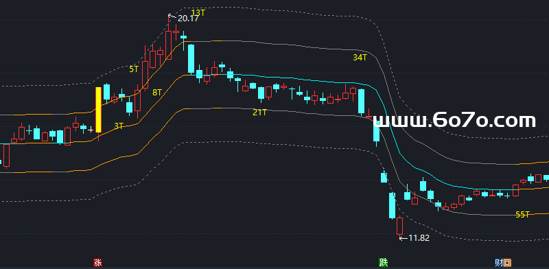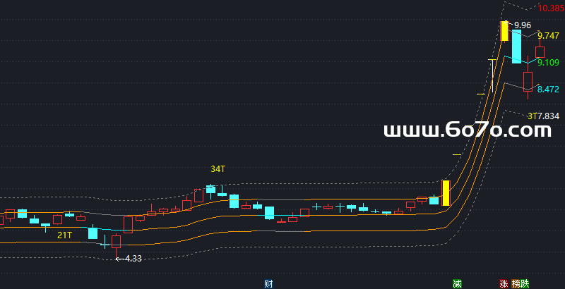 通达信改装的融胜通道指标源码: (指标口令:ZS250613)CC:=ABS((2*CLOSE+HIGH+LOW)/4-MA(CLOSE,20))/MA(CLOSE,20);DD:=DMA(CLOSE,CC);上:(1+7/100)*DD,COLORGRAY;下:(1-7/100)*DD,COLORGRAY;中:(上+下)/2,COLORF0F000;危:(1+14/100)*DD,DOTLINE,COLORGRAY;机:(1-14/100)*DD,DOTLINE,COLORGRAY;IF(上>=REF(上,1), 上,DRAWNULL),COLOR0099FF;IF(中>=REF(中,1), 中,DRAWNULL),COLOR0099FF;IF(下>=REF(下,1), 下,DRAWNULL),COLOR0099FF;DRAWNUMBER(ISLASTBAR,上,上),COLOR00FFFF;DRAWNUMBER(ISLASTBAR,下,下),COLORFFFF00;DRAWNUMBER(ISLASTBAR,中,中),COLOR00FF00;DRAWNUMBER(ISLASTBAR,危,危),COLOR0000FF;DRAWNUMBER(ISLASTBAR,机,机),COLORWHITE;{财务数据}DRAWTEXT_FIX(ISLASTBAR,0.18,0.01,1,'上市日期:'),COLOR00FF00;DRAWNUMBER_FIX(ISLASTBAR,0.18,0.01,0,FINANCE(42)),COLOR00FF00;DRAWTEXT_FIX(1,0.01,0.13,0,EXTERNSTR(0,1)),COLORRED;DRAWTEXT_FIX(1,0.26,0.01,0,EXTERNSTR(0,2)),COLORDD00DD;DRAWTEXT_FIX(1,0.01,0.066,0,EXTERNSTR(0,3)),COLOR00DD00;DRAWTEXT_FIX(ISLASTBAR ,0.06,0.01,1,DYBLOCK),COLORYELLOW;DRAWTEXT_FIX(ISLASTBAR ,0.065,0.01,0,HYBLOCK),COLORYELLOW;{涨停标注}STICKLINE(C/REF(C,1)>1.095,C,O,2,0),COLORYELLOW;{涨停天数}VARZT:=BARSLAST(C/REF(C,1)>1.094);DRAWTEXT(VARZT=2,L*0.95,'3T'),COLORYELLOW;DRAWTEXT(VARZT=4,H*1.06,'5T'),COLORYELLOW;DRAWTEXT(VARZT=7,L*0.95,'8T'),COLORYELLOW;DRAWTEXT(VARZT=12,H*1.06,'13T'),COLORYELLOW;DRAWTEXT(VARZT=20,L*0.95,'21T'),COLORYELLOW;DRAWTEXT(VARZT=33,H*1.06,'34T'),COLORYELLOW;DRAWTEXT(VARZT=54,L*0.95,'55T'),COLORYELLOW;DRAWTEXT(VARZT=88,H*1.06,'89T'),COLORYELLOW;DRAWTEXT(VARZT=143,L*0.95,'144T'),COLORYELLOW;DRAWTEXT(VARZT=232,H*1.06,'233T'),COLORYELLOW;DRAWTEXT(VARZT=376,L*0.95,'377T'),COLORYELLOW;