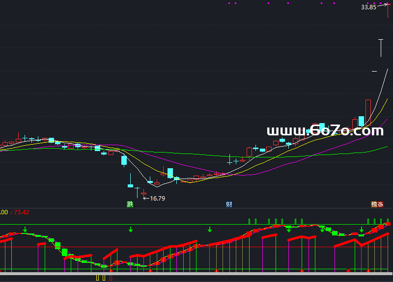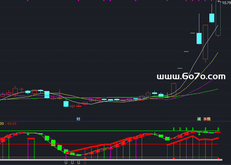 LC:=REF(CLOSE,1);RSI5:=((SMA(MAX((CLOSE - LC),0),5,1) / SMA(ABS((CLOSE - LC)),5,1)) * 100);TR1:=SUM(MAX(MAX((HIGH - LOW),ABS((HIGH - REF(CLOSE,1)))),ABS((LOW - REF(CLOSE,1)))),10);HD:=(HIGH - REF(HIGH,1));LD:=(REF(LOW,1) - LOW);DMP:=SUM(IF(((HD > 0) AND (HD > LD)),HD,0),10);DMM:=SUM(IF(((LD > 0) AND (LD > HD)),LD,0),10);PDI:=((DMP * 100) / TR1);MDI:=((DMM * 100) / TR1);ADX:=MA(((ABS((MDI - PDI)) / (MDI + PDI)) * 100),5);AV:=(RSI5 + ADX);DXR:=(((ADX + REF(ADX,5)) / 2) + RSI5);0,COLORFF00FF;WR10:=((100 * (HHV(HIGH,10) - CLOSE)) / (HHV(HIGH,10) - LLV(LOW,10)));NEWVOL:=(RSI5 - WR10);阶段底部:=(AV + NEWVOL);STICKLINE((阶段底部 < 0),0,-10,0.8,1),LINETHICK6,COLORYELLOW;趋势线:=LLV(阶段底部,1),COLORWHITE,LINETHICK0;STICKLINE(CROSS(阶段底部,0),0,-10,0.8,1),LINETHICK6,COLORRED;STICKLINE((趋势线 >230 ),100,90,0.3,1),LINETHICK6,COLORGREEN;LOWV:=LLV(LOW,9);HIGHV:=HHV(HIGH,9);RSV:=EMA((CLOSE-LOWV)/(HIGHV-LOWV)*100,3);K:EMA(RSV,3);D:MA(K,3); STICKLINE(K>D , K,D ,2.5,0),COLORRED,LINETHICK2;STICKLINE(D>K,K,D,2.5,0),COLORGREEN,LINETHICK2;逃顶线:90,COLORGREEN;中轴线: 50,COLORRED;抄底线:10,COLORGREEN;DRAWICON(CROSS(K,D),12,1)COLORRED;DRAWICON(CROSS(D,K),88,2)COLORGREEN;警戒:阶段底部 < 0,LINETHICK0,COLORYELLOW;出击:CROSS(阶段底部,0),LINETHICK0,COLORRED;AA1:=(CLOSE-LLV(LOW,9))/(HHV(HIGH,9)-LLV(LOW,9))*200-100;AA2:=SMA(AA1,3,1);AA3:=SMA(AA2,3,1);AA4:=(3*AA2-2*AA3)/5+50;AA5:=DRAWLINE(AA4<REF(AA4,1),AA4,AA4>REF(AA4,1),AA4,0);AA6:=AA4>REF(AA4,1);AA7:=DRAWLINE(AA6,AA4,AA4<REF(AA4,1),AA4,0);AA8:=(EMA(CLOSE,12) - EMA(CLOSE,26));AA9:=EMA(AA8,9);AA0:=HHV(MAX(AA2,MAX(AA3,AA4)),250);BB1:=HHV(MAX(AA8,AA9),250);BB2:=INTPART(AA0/BB1)/2;BB3:=BB2*AA8+50;BB4:=BB2*AA9+50;BB5:=1.5*(BB3-BB4)>REF(1.5*(BB3-BB4),1);STICKLINE(BB5,0,AA5,0,-1),COLOR77FFFF;STICKLINE(AA4<REF(AA4,1),0,AA5,0,1),COLORFF00FF;STICKLINE(AA6,0,AA7,0,1),COLOR00FF00;STICKLINE(CLOSE>0,4,-1,5,0),COLORBBBBBB;AA5,COLOR0000FF,LINETHICK5;