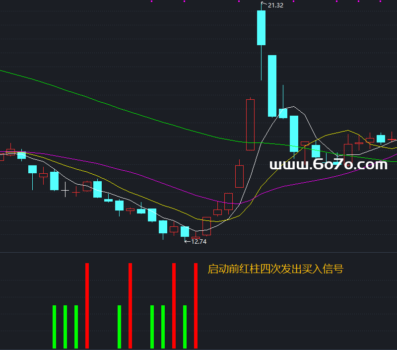 这时候指标会画出一根红色柱子(STICKLINE),这就是我们的信号:市场情绪触底反弹的临界点。