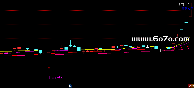 ④ 核心信号 “打天下梦想”:买卖点一键标记最后把这些数据汇总成 “打天下梦想” 指标,上穿 0 轴时弹出 红箭头,意思是 “多方发力了,可以盯紧”;VARR1 跌破 82 出现 “天下太平”,就是提醒 “势头弱了,该收网了”。