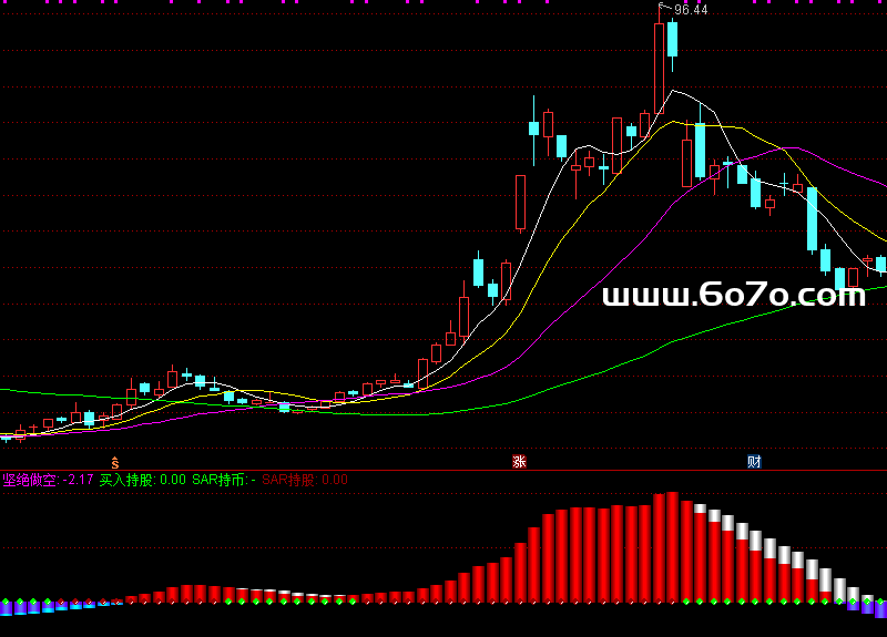 02 实战风云:一个老股民的血泪教训与顿悟记得2022年操作某新能源龙头,正是靠这个指标躲过大坑、咬住大肉:逃顶实录:股价高位震荡,红柱(买入持股)越来越矮,白柱(获利回吐)却日益高耸,同时绿色SAR持币圆点在K线头顶若隐若现。当三者共振发出风险信号时,我果断止盈。不久后该股开启近30%的深度回调!白柱预警+绿圆点确认,让我成功锁定利润。抄底良机:股价深跌后,绿柱(坚决做空)开始缩短,黄柱(空头回补)悄然露头。某日突然放量,黄柱拔地而起的同时,深蓝SAR持股圆点精准出现在K线脚底。双重信号确认,我果断进场,成功吃到了后续的主升浪!