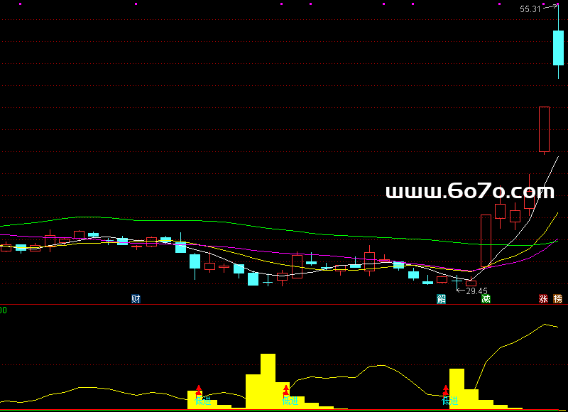 03 实战案例:从怀疑到真香去年操作新能源龙头时,我亲历了它的神奇。当股价阴跌不止,市场一片哀嚎时,副图上突然出现三个信号共振:1.黄色趋势线在20下方金叉2.红色买入箭头连续闪烁3.能量柱由绿转红并持续放大