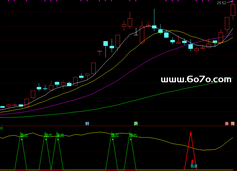 第二层筛子:绝望探测器(红色箭头)当趋势温度计突破关键阈值,副图上会弹出醒目的红色箭头⬆️。这往往是市场绝望时出现的曙光,专业术语叫指标共振买点。