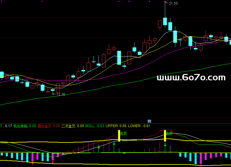 低位金叉:CROSS(A,B) AND A<-0.1,COLORRED;