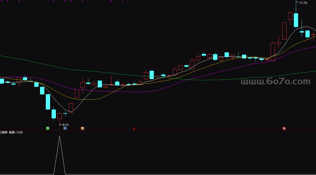 04 实战应用:我是如何用春笋指标抓住三只翻倍股的第一次实战:踩准节奏,收获30%记得2023年10月,市场一片惨淡,我通过春笋指标筛选出某只新能源概念股。当时股价已经腰斩,技术指标显示超跌,但春笋信号迟迟未出现。直到10月18日,该股放量上涨3.5%,春笋信号终于亮起。我果断在收盘前介入,随后两周内,该股连续拉升,最高涨幅达35%。这次经历让我深刻体会到:春笋指标不是预测未来,而是捕捉主力已经动手的信号。它帮我克服了“不敢买跌”的心理障碍。