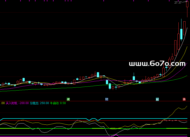 关键操作口诀:📌 买入时机:C1上穿-150线(紫色信号线)+ 吸筹柱放量;📌 加仓点:C2突破-70线(绿色“牛启动”信号),趋势确认加速;📌 逃顶信号:当“分批出”指标(青色线)从250回落至200,立刻减仓!