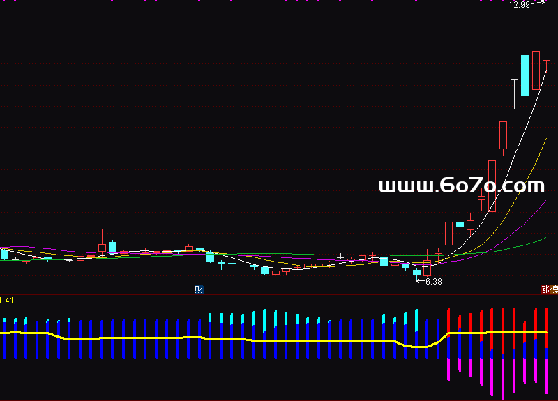 操作结果:该股随后3周上涨40%,套牢盘(黄线)始终<10%,上方无压力!