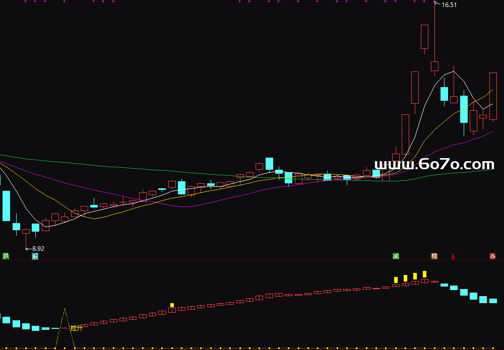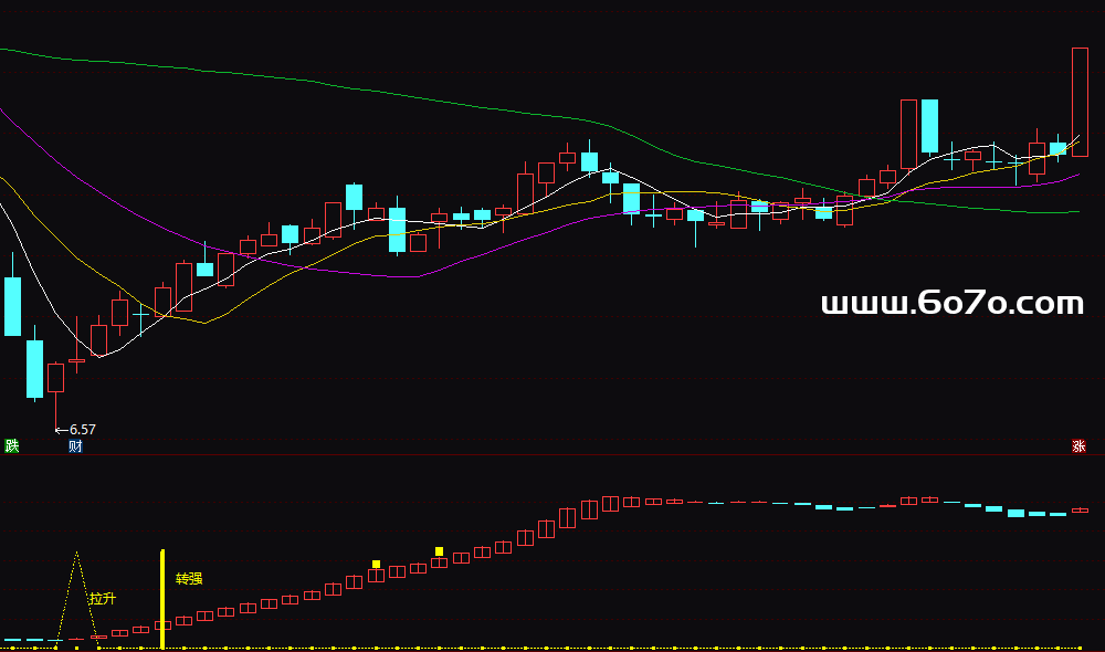 案例1:新能源龙头的“极地抄底”2024年3月,某电池股连续阴跌,出现“低位转强”黄柱,同时: