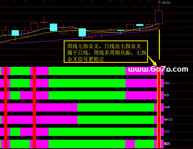 ✅ 第三步:终极筛选“七指金叉”,日周月共振才是王炸!最绝的来了!过了龙门、拿了四喜的股票,还要被扔进“七指金叉”模型里再筛一遍。这玩意儿是我压箱底的宝贝——日线、周线、月线,只要有两个周期以上出现“七指翻红”(7个技术指标同步金叉),直接锁定为“重点目标”!