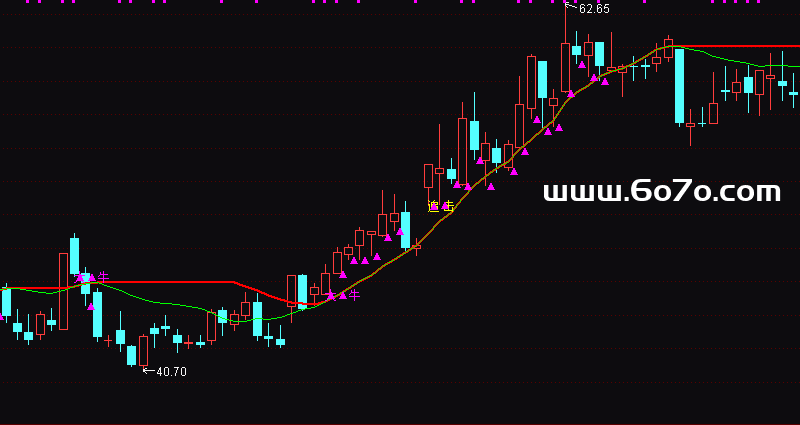 出现▲是大牛:(买线>=卖线) AND (跌破受阻上支撑=穿越红线才能牛) AND (主力线>散户线),COLORFF00FF,NODRAW;