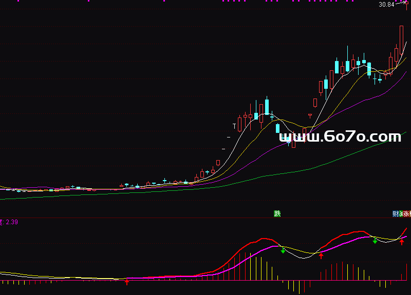 抄底紫箭+黄转红柱:股价连跌后突现紫色箭头,同时能量柱由黄转红(空翻多),当天介入,3周盈利37%。口诀:“深坑紫箭抬头,跟上别撒手!”