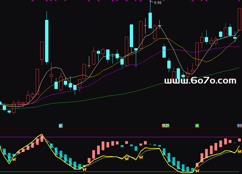 这个指标的核心,是用颜色语言告诉你市场情绪: 绿色“盘底线”(15):像地面支撑,跌到这里别慌,可能是机会; 紫色“盘顶线”(85):如天花板压力,涨到这里要警惕; 黄白双线:黄线=短期动能,白线=长期趋势。黄线上穿白线(出现↑箭头),就像短跑选手反超,预示上涨启动!举个栗子🌰:当K线(黄)和D线(白)紧贴时,红蓝柱状图会像“温度计”一样变色——红柱(多头进攻)蓝柱(空头反扑),一眼看穿多空博弈! #指标拆解#小白秒懂