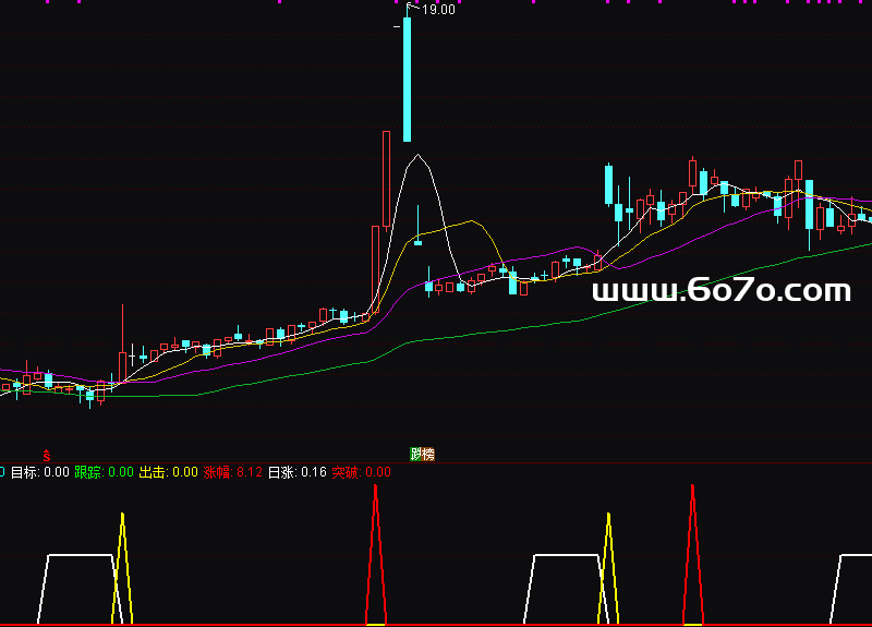 出击:IF(CROSS(0.1,目标) AND CROSS(MACD,0),8,0),COLOR00FFFF,LINETHICK2;