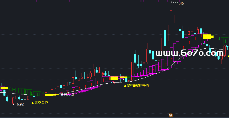 DRAWTEXT(CROSS(VAR6,VAR7) AND VAR7<VAR8,VAR3*0.95,'▲多空争夺'),COLORYELLOW;