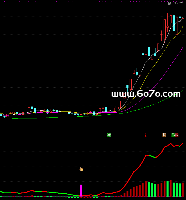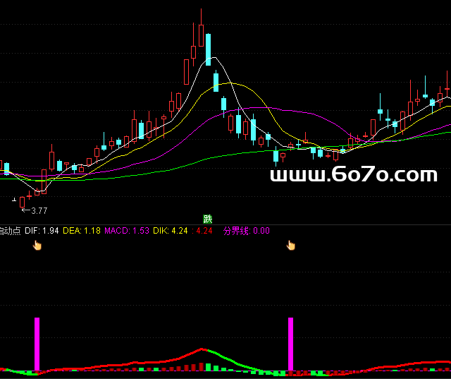 STICKLINE(启动点,8,MACD,2,0),COLORMAGENTA; //紫色柱出现即信号!