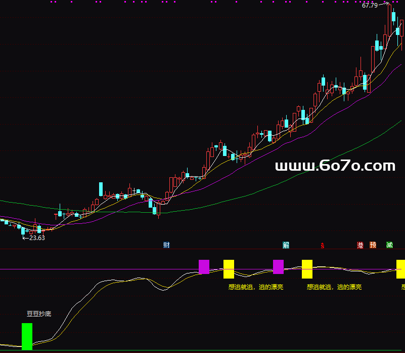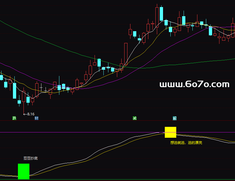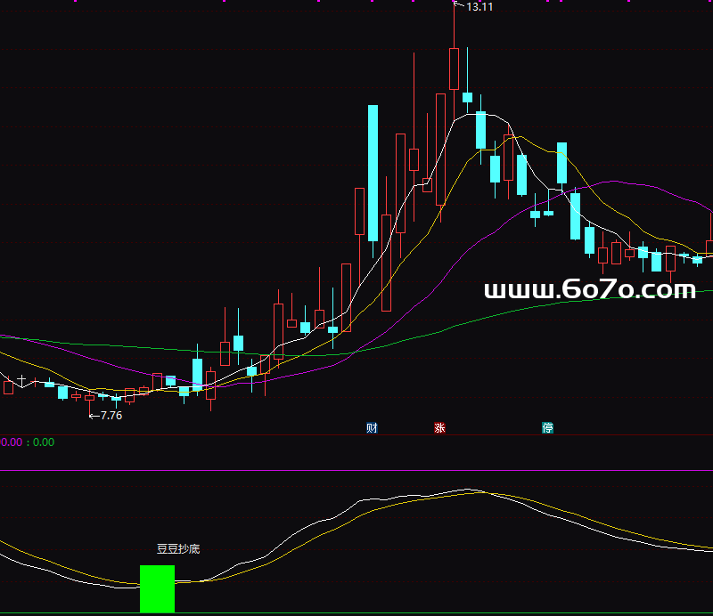 把36天最高价想成天花板,36天最低价想成地板,收盘价就是你在房间里蹦的高度。公式先算"蹦高百分比",再连做三次"平滑按摩"——也就是3层SMA,把毛刺熨成绸缎。当快线(VAR3)从下往上金叉慢线(VAR4),且俩人都还在20以下"地下室",系统就喊一句"豆豆抄底"。逻辑一句话:市场跌麻了,绸缎突然打个蝴蝶结,就是短线情绪反转的"第一口喘息"。