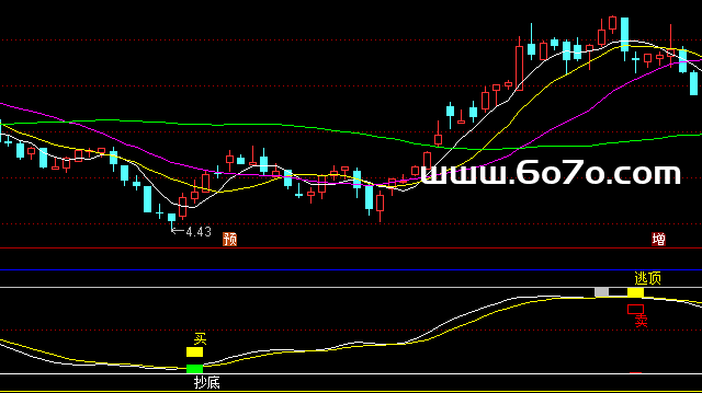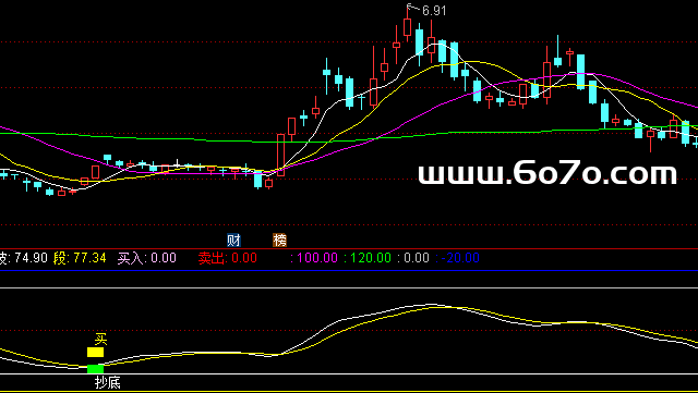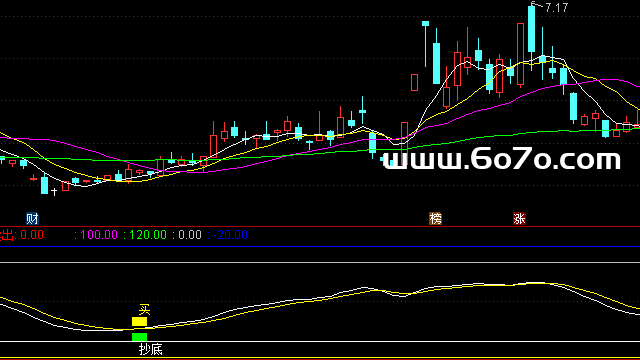 买入信号 := 波线上穿段线 AND 波线<20DRAWTEXT(买入信号, 40, '买'), COLORYELLOW// 在K线下方标记黄色买字