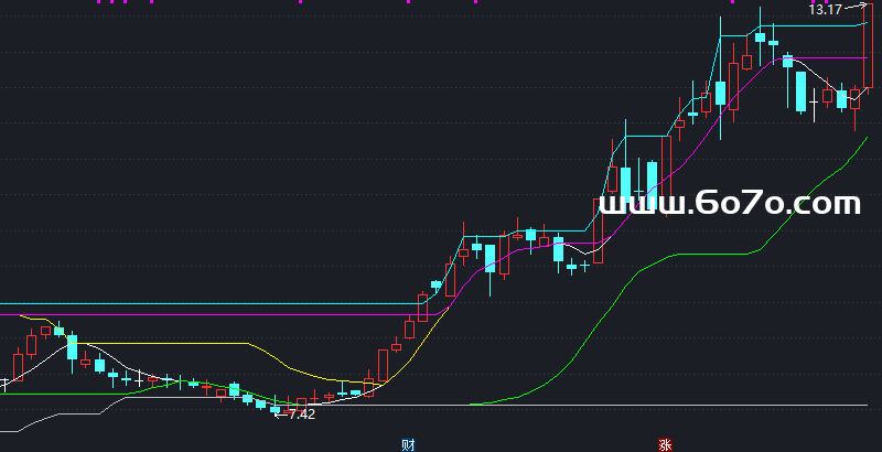 买卖信号:当操作线上穿紫色"买卖线"(13日最低轨迹),就是主力吸筹的黄金买点;当它下穿买卖线,赶紧撤退!