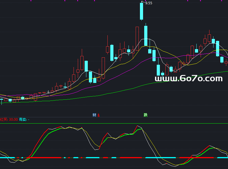 当 K线向上穿越D线,表示多头占优,源码中 “红买”信号(🔴红色粗线)在30位置亮起,提示 买入时机;反之,K线下穿D线,“青卖”信号(🟡黄色粗线)出现,暗示考虑 卖出。