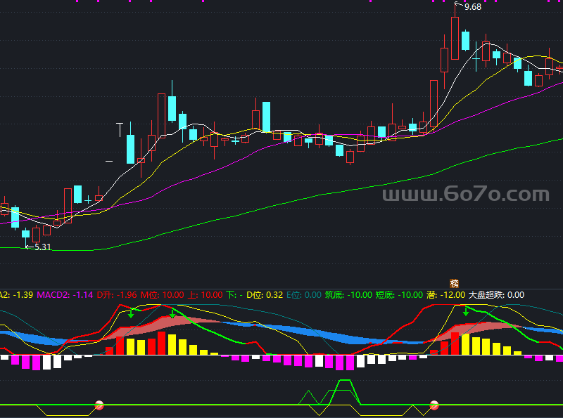 M升:STICKLINE(MACD2<0 AND MACD2>=REF(MACD2,1),0,MACD2,2.5,0)COLORWHITE;