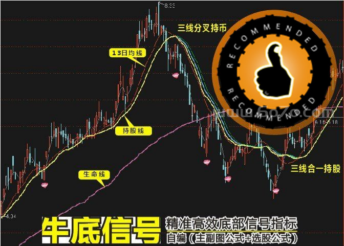 📈 第一层:看清市场的“中轴线”和“生命线”指标里用到了两条关键的线:“持股线”(绿色)和“生命线”(粉紫色)。你可以把“生命线”理解为一段时期内市场所有参与者的平均持股成本线,它是多空力量的长时期分界线。价格在它之上,说明多方占优;之下,则空方主导。而“持股线”则是短期趋势的强化,它更加灵敏。当股价经过下跌,开始站稳“生命线”,并且短期“持股线”也拐头向上时,说明市场生态正在从雨转晴。