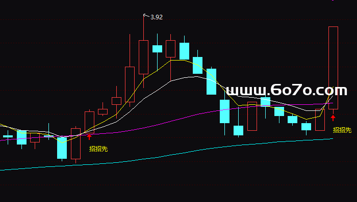 2️⃣ 关键信号:当V1(5日线)从下往上,穿过那个加了“缓冲垫”的长期趋势线V2时,程序就会在K线下方标记一个黄色的“招招先”信号。这就像是“短跑选手”正式超越了“长跑健将”,并得到了后者的确认——市场短期攻击的“爆发力”,得到了长期“耐力”趋势的支撑,形成了共振。