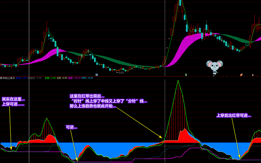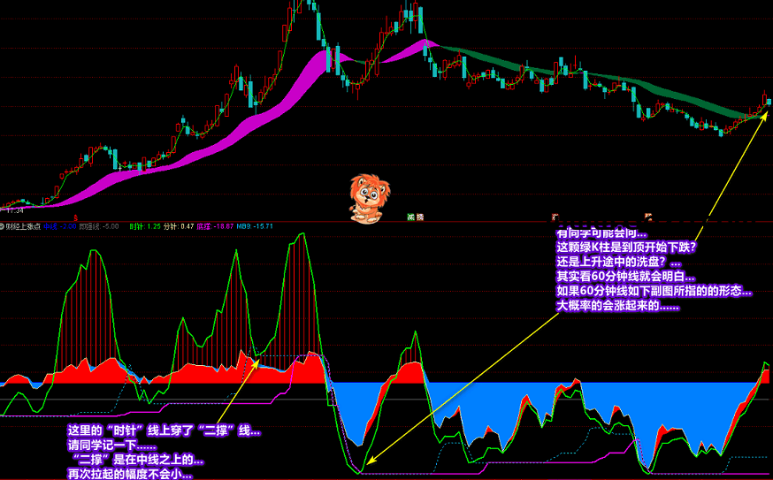 🔵 蓝色区域:当“分针”落到“时针”下面,区域变为蓝色。这暗示短期动能可能跟不上,或者开始回调,也就是“蓝色区休息”的时候。
