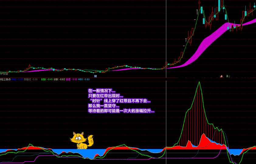🔴 红色区域:当“时针”运行在“分针”上方时,图表会显示为红色区域。这告诉你,中短期势头一致向上,多头占优。这就是源码里 STICKLINE(MB1>MB6,MB1,MB6,0,1),COLORRED; 这一句所画出的效果,也是“红色区操作”的视觉依据。