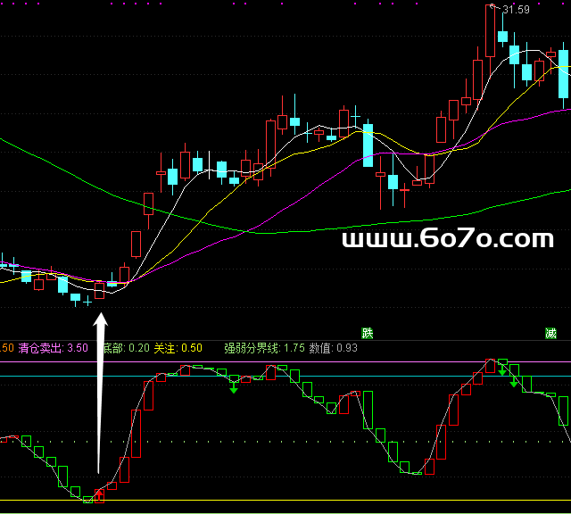 设阈值底部 := 0.2(动力值低于0.2,股票超卖,像跌到谷底);关注 := 0.5(超过0.5,表示开始走强,半山腰加油)。