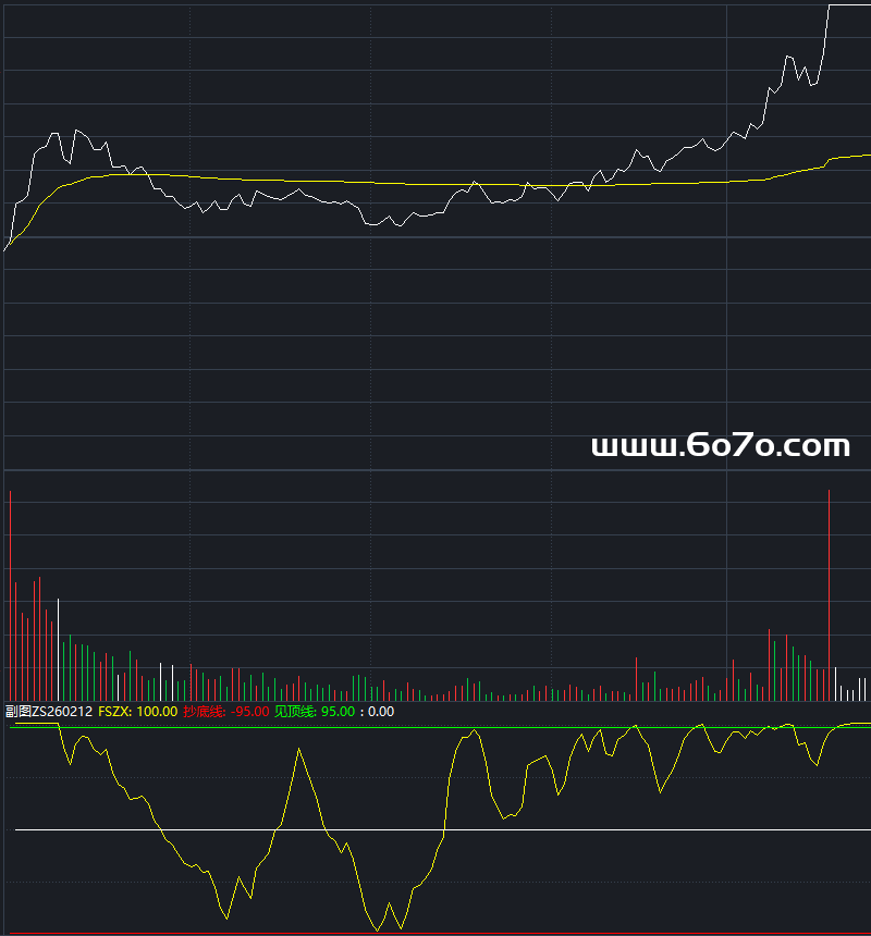 抄底线:-95,COLORRED;和 见顶线:95,COLORGREEN;这是指标给你画好的两条重要参考线。当黄色的FSZX线向下穿过-95这条红色“抄底线”时,意味着股价在短期内跌到了一个极其超卖的位置,就像潜水憋气到了极限,反弹的可能性在增加。反之,向上穿过95的绿色“见顶线”则提示短期超买。最后那句IF(FSZX<=-95,-100,COLORWHITE),是当信号跌穿-95时,在副图底部打一个白色的标记点,相当于给你一个更醒目的“叮!”的提示音。