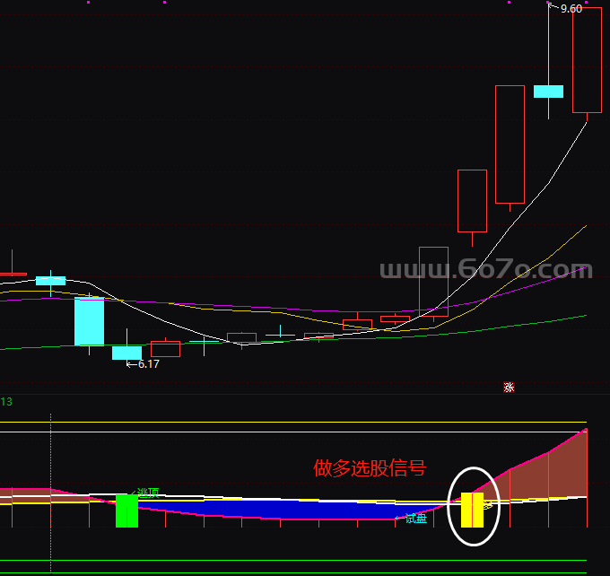 咋得出的?一步步拆解:首先,A2A:=A-A11(重复短期减长期差值),MID1:=MA(A2,18) 是差值的18天均线。选股触发条件是CROSS(A2A,MID1)——当短期差值"上穿"中期均线时,显示"←多"信号。