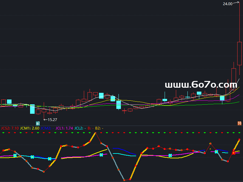 IF(卖出>0 ,JCL,DRAWNULL),CROSSDOT,LINETHICK6,COLORCYAN;