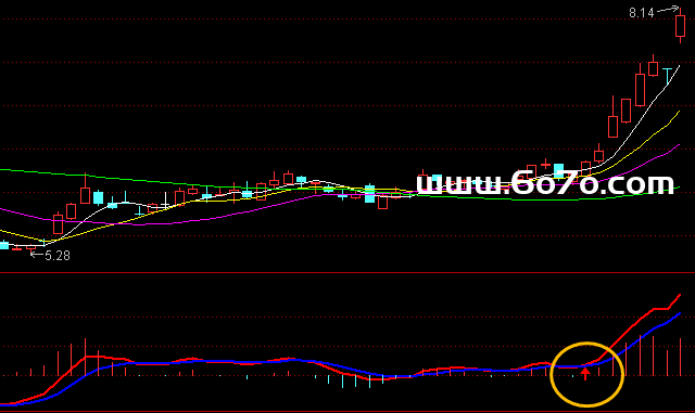 这里用6日和10日的指数移动平均线(EMA)之差来代表短期动能(DIF),再用DIF的5日平均线(DEA)来代表动能的"平均速度"。